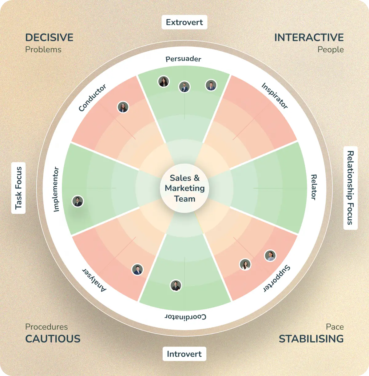 - Where each person sits – each team member is plotted on the wheel based on their Behaviour profile.