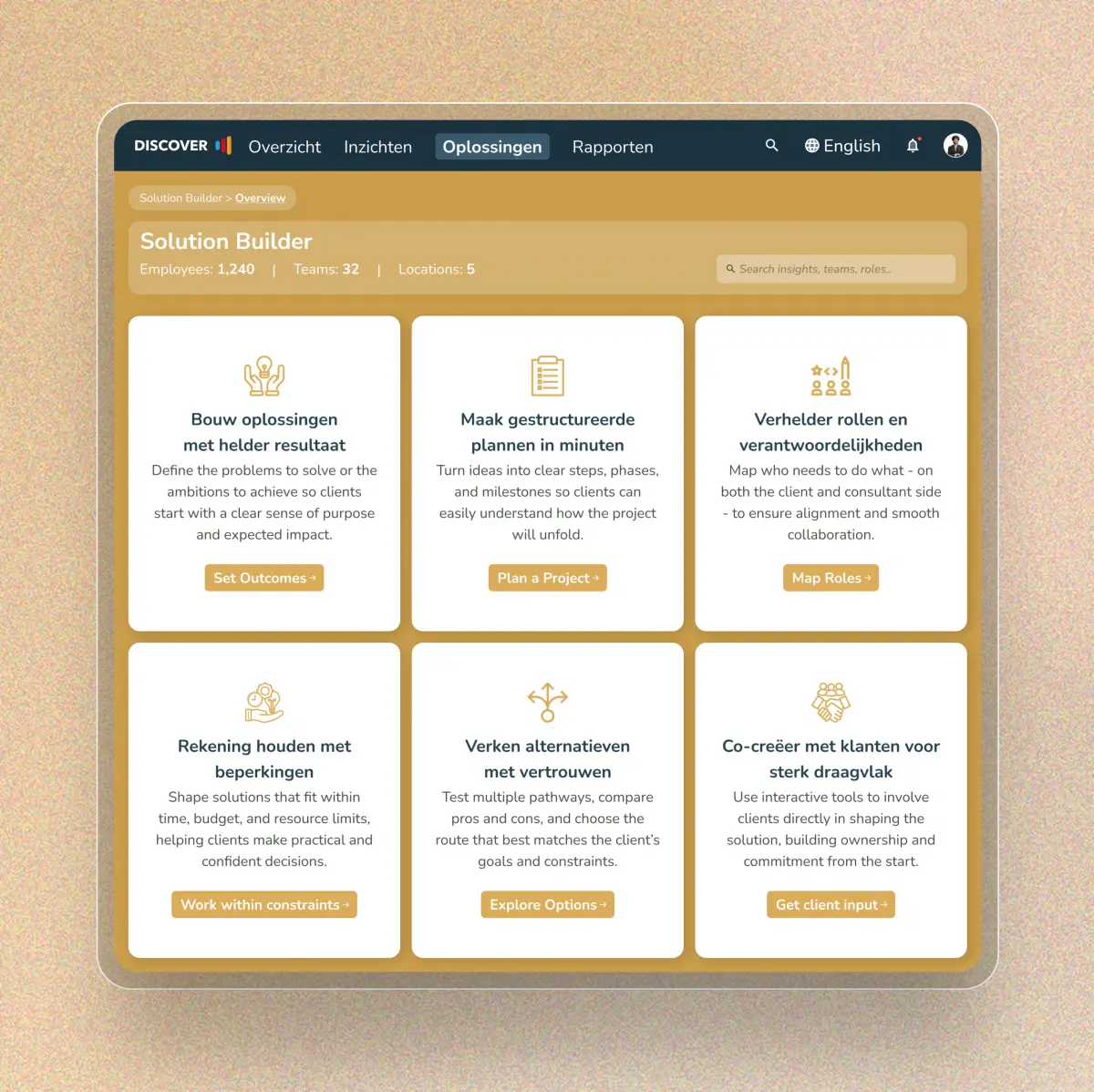 Renkai helpt consultingteams en HR professionals om DISCOVER Inzichten en relevante context informatie om te zetten in heldere acties — met AI-ondersteunde workflows en visuele delivery tools. Lever sneller, besteed minder tijd aan voorbereiding en maak client-ready outputs die zorgen voor echte verandering. Minder tijd, meer impact.