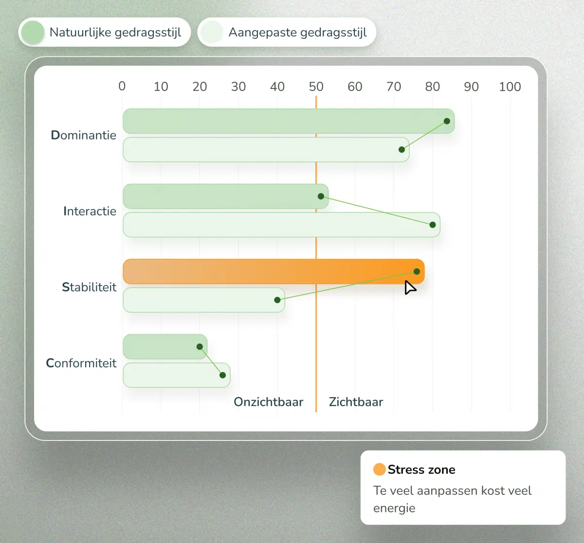 Mensen presteren zelden op hun best in volledige comfort — maar ook niet in constante stress. DISCOVER Gedrag helpt je zien of iemand opereert vanuit de comfortzone, stretchzone of stresszone: