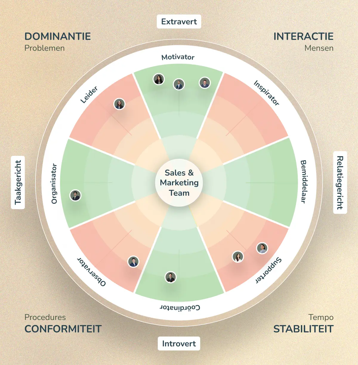 Het teamwiel van gedrag visualiseert het gedrag van je hele team in één helder overzicht. Je ziet direct hoe mensen verdeeld zijn over de verschillende gedrsagssstijlen — en wat dat betekent voor communicatie, samenwerking en besluitvorming.
